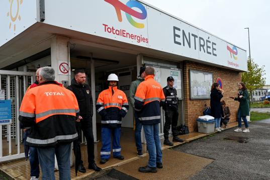 Employees stand at an entrance of the TotalEnergies fuel depot of Mardyck, near Dunkirk, northern France, on October 13, 2022, after essential striking workers were ordered by the French government to return to work. - Unions are seeking pay hik...