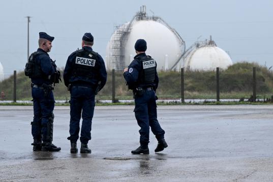 Policemen stand outside the TotalEnergies fuel depot of Mardyck, near Dunkirk, northern France, on October 13, 2022, where essential striking workers were ordered by the French government to return to work. - Unions are seeking pay hikes in resp...