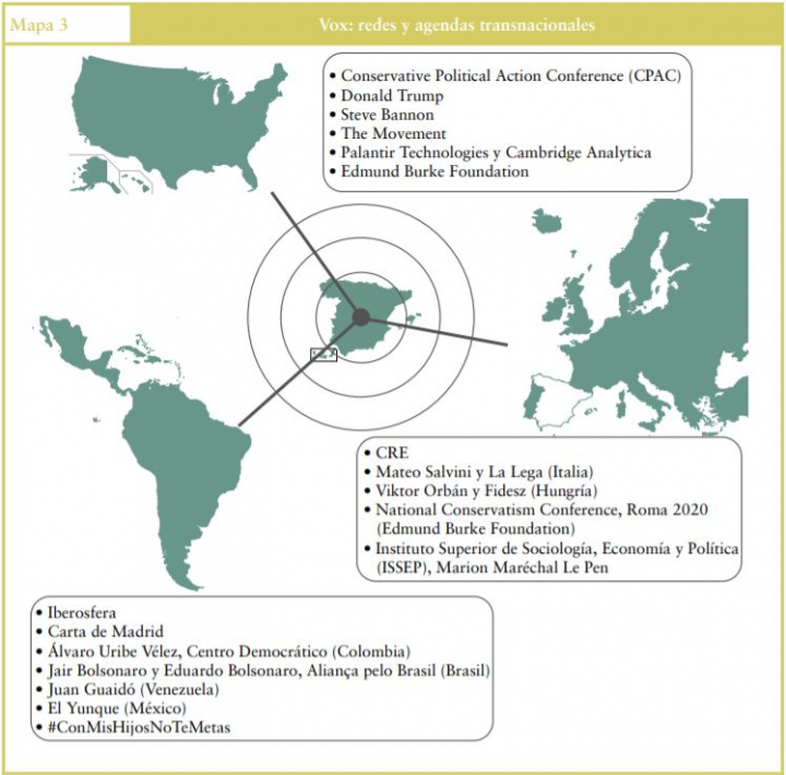 El mapeo de redes de la extrema derecha demuestra, por un lado, que Vox “mantiene fuertes sus vínculos con las viejas élites conservadoras del país” —Fundación Francisco Franco, Abogados Cristianos, Grupo Intereconomía— pese a su discurso anti-establishment; por otro lado, pone de relieve su dimensión transnacional, revelando “conexiones con una pléyade de organizaciones numerosas, financiadas y respaldadas por gobiernos afines —entre otros, la anterior Administración Trump en EEUU, el gobierno Bolsonaro en Brasil o el Centro Democrático en Colombia— y con estrechos intereses empresariales”.