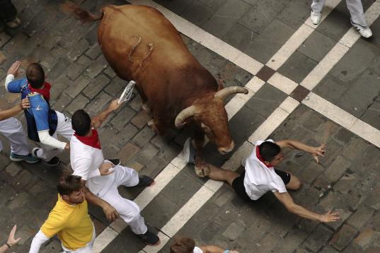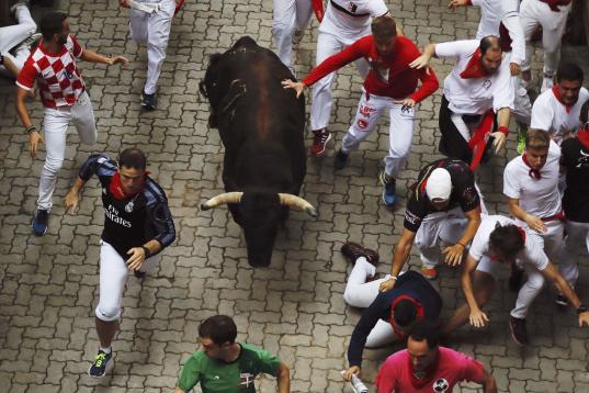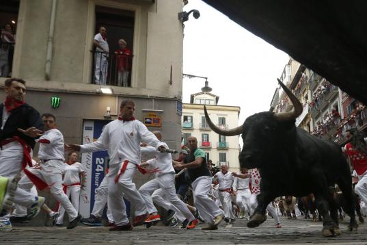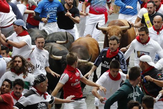 Los toros, cuatro negros y dos marrones, han salido hermanados del corral. En la cuesta de Santo Domingo, uno de ellos, Fundador, ha cogido la delantera, puesto en el que se han ido turnando hasta la calle de Estafeta, donde casi han volado sobre el adoquinado.