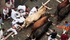 En la parte final de ese tramo se han vivido los momentos más peligrosos al caer uno de los cabestros, lo que ha hecho que algunos de los astados chocaran con él y varios mozos llegaran a caer al suelo.