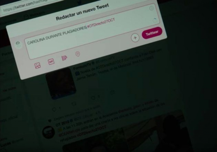 En su desdicha porque su amigo Diego, cantante de Carolina Durante, le ha robado la canción para cantarla con la artista navarra, le escribe al grupo mensajes directos de Instagram, tuitea mencionando a la productora y utiliza el hashtag del programa para mandarles un mensaje: "CAROLINA DURANTE PLAGIADORES". Detrás, se ven diversas noticias del programa e incluso su cuenta oficial de Twitter.