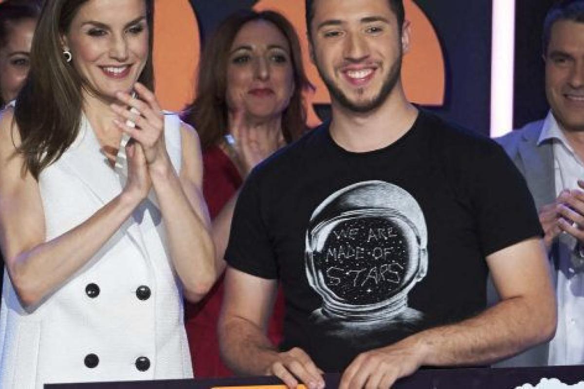 La reina Letizia entrega el premio del concurso Famelab a Pedro Pajares.Getty Images