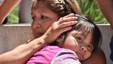 Una refugiada corre hacia la frontera de Francia con un niño en brazos.