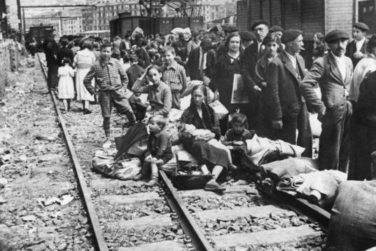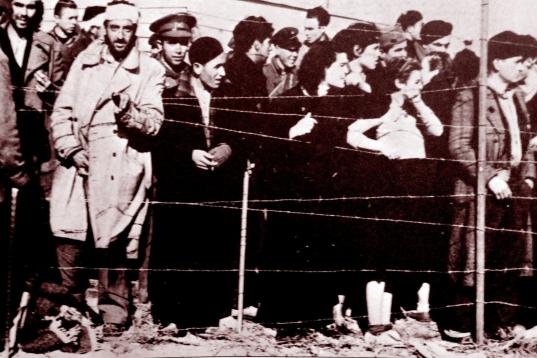 Refugiados republicanos españoles (soldados y civiles) tras una valla en un campo de concentración en Francia en 1939.