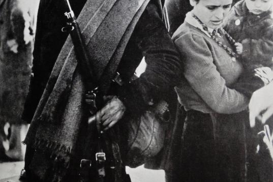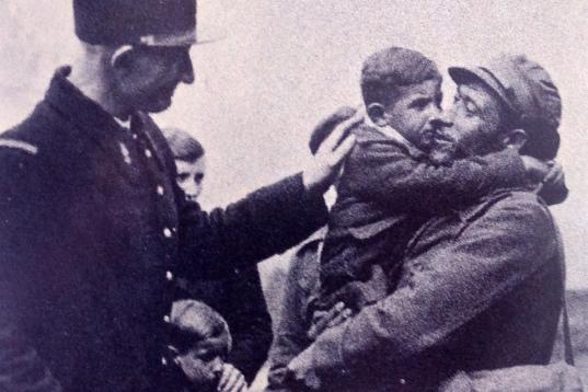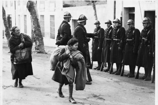 Un soldado francés ayuda a una familia española a cruzar la frontera durante la Guerra Civil.