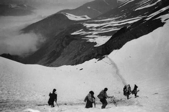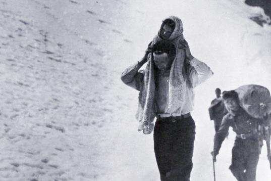Refugiados cruzan las montañas cubiertas de nieve para escapar de España a Francia durante la Guerra Civil.