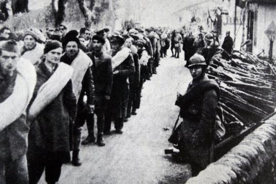 Soldados republicanos entregan sus armas en la frontera francesa cuando huyen de España.