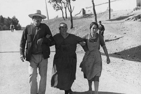 Refugiados españoles ayudan a otro en su camino a cruzar la frontera a Francia para escapar de las fuerzas fascistas de España.