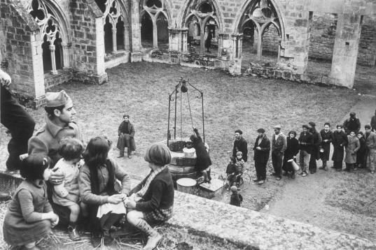 Un soldado se sienta con unos niños mientras los refugiados españoles hacen cola ante un pozo en una abadía de Francia que servía de campo de refugiados entonces.