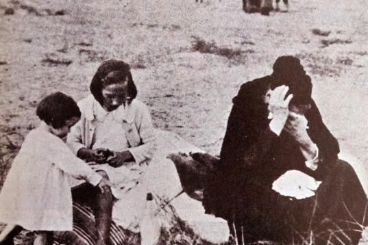Una mujer y dos niñas españolas refugiadas se sientan a descansar.