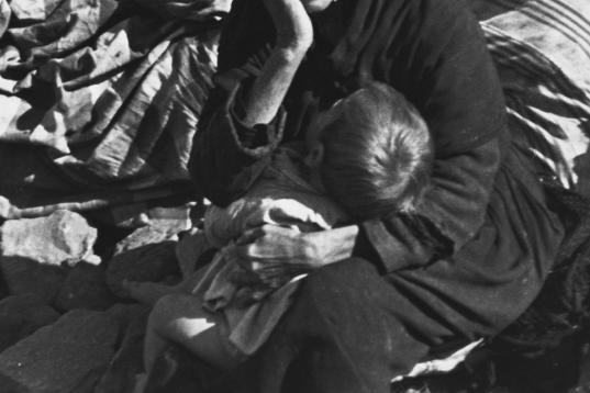 Una mujer refugiada de Málaga se sienta a descansar con su hijo en el camino a Barcelona, Valencia, o Alicante.