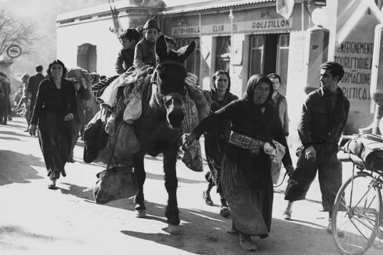 Una mujer conduce una mula con sus pertenencias por las calles de Le Perthus durante la Guerra Civil en 1939.