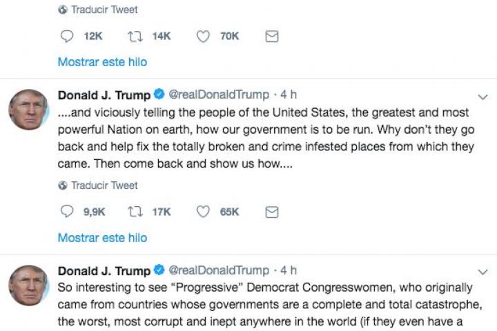 En sus tuits, Trump preguntó “por qué esas legisladoras no vuelven a sus países y ayudan a arreglar los lugares completamente rotos e infestados de crimen de donde vienen. Entonces, vuelvan y muestren cómo se hace. Esos lugares necesitan mucho su ayuda, no se pueden marchar tan rápido. Estoy seguro de que Nancy Pelosi estará muy contenta de resolver arreglos de viaje gratis”.