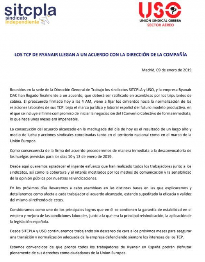 "La consecución del acuerdo alcanzado en la madrugada del día de hoy es el resultado de un largo año y medio de lucha y acciones sindicales coordinadas tanto en el territorio nacional como en el marco de la Unión Europea. Como consecuencia de la firma del acuerdo procederemos de manera inmediata a la desconvocatoria de las huelgas previstas para los días 10 y 13 de enero de 2019", han indicado los sindicatos.