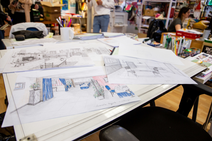Aquí se puede conocer la historia de Cuéntame en dibujo: cualquier escenario pasa por el lápiz de estos profesionales antes de montarse. Ya sabemos, antes de su emisión, cómo será la arrocería de Paquita. No se trata solo de imaginar, estudiar, dibujar y montar. Una vez que tienen el escenario y que graban la secuencia, hay que tocar el color y meterle filtros en postproducción para conseguir la textura y la calidad de la imagen, para que no chirríe lo nuevo que en realidad es cada espacio con la época que nos intentan vender. Para ello también tienen otras fuentes de inspiración, por ejemplo, en el capítulo en el que Merche y Antonio viajan a Canarias, Pareja made in Spain, el equipo tomó las referencias del cine de Alfredo Landa. Al final, los decorados son nuevos y hay que envejecerlos. "Que haya sido vivido y se note. Como el vestuario, que hay que sufrirlo", añaden.