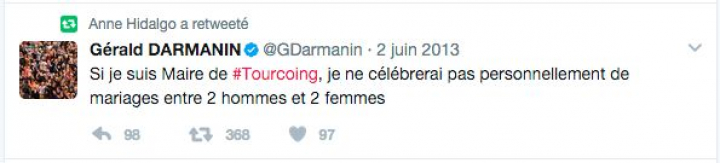 El motivo de la indignación en Twitter es que Gérald Darmanin, miembro del partido conservador Los Republicanos, se opone rotundamente al matrimonio igualitario. Así que los usuarios quisieron recordárselo a Macron, compartiendo los retrógrados tuits y declaraciones públicas de Darmanin en los que, en 2012 y 2013, criticaba el matrimonio homosexual (y otras medidas sociales ampliamente aceptadas):