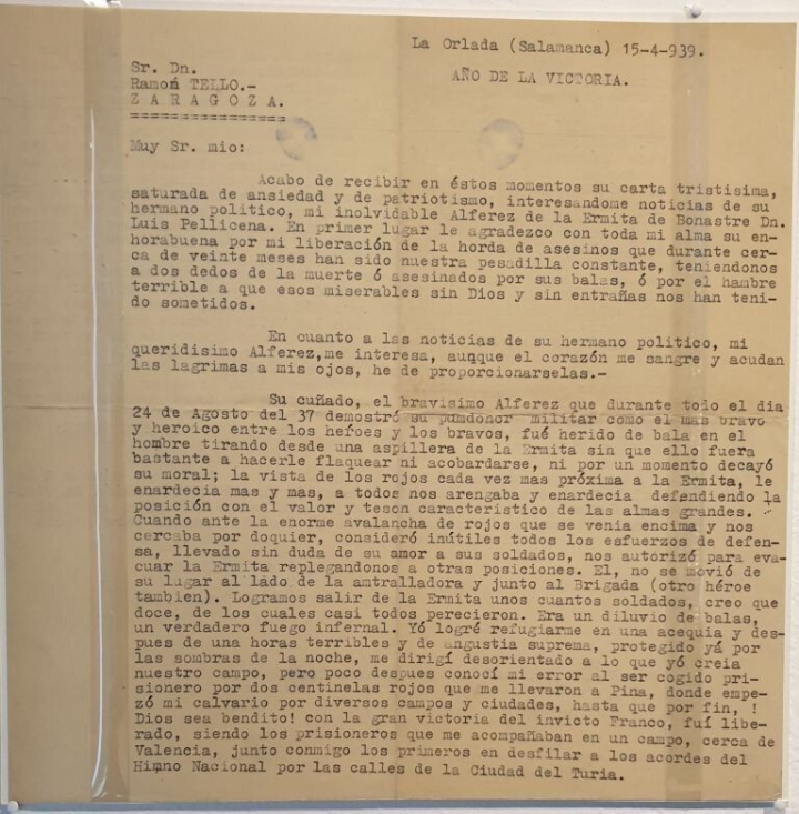 Era un escrito firmado en 1939 por un mando militar que, por aquel entonces, habían enviado a los familiares del fotógrafo que entonces vivían en Zaragoza. Mecanografiado sobre un papel ya amarillado por el paso del tiempo, el estilo del mensaje sonaba un tanto épico. “En ella relataban cómo mi abuelo, que había luchado como un héroe —esas cosas que dicen los militares— había sido fusilado”, recuerda Areñas gesticulando, suponemos que con el mismo desconcierto de hace una década. Hasta ese momento, entre 2008 y 2009, la cuestión —como aún sigue ocurriendo con temas tabús en muchas hogares de España— nunca se había hablado. “Dicen que antes de ser disparado, sacó una foto de mi madre y mi tío y la besó”, añade el fotógrafo.