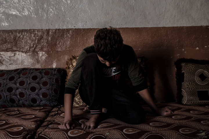 Ayman Farouq, de 16 años, en su casa en Sinuni el pasado mes de septiembre. “Mi familia es de Tal Qasab, al sur del monte Sinyar. Tras el genocidio de 2014 huimos a la montaña y estuvimos viviendo allí. Un día, en 2015, sufrí la explosión de una mina. Perdí mi brazo izquierdo y recibí impactos de metralla en mis pies y mis piernas. A día de hoy, aún tengo más de 50 trozos de metralla incrustados. Me duele todo el tiempo, no puedo pensar en otra cosa y no logro dormir debido al dolor. Sufro lo que llamamos tafkir, que viene a ser algo así como “pensar demasiado”. Todo es a causa del dolor. Me siento triste y estoy siempre nervioso”.