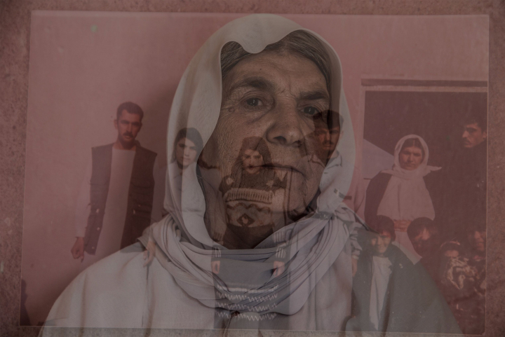 Halo Khalaf, de 66 años, en su casa de Sinuni el pasado mes de septiembre. ”Somos originarios del sur del monte Sinyar. No tengo hijos. Mi esposo murió antes del genocidio. Antes de 2014, vivía con Khader, que era mi único hermano, y con su familia. Khader fue secuestrado por el ISIS y nunca regresó. En realidad fuimos secuestrados juntos, pero yo pude escapar después de 20 días en cautiverio. Sigo esperando a Khader. Tengo la esperanza de que un día regresen todos los secuestrados. Son tantas las personas de mi familia que han sido secuestradas... Casi toda la familia de mi hermano fue secuestrada. Algunos regresaron, otros no. Uno de mis sobrinos está actualmente con el ISIS en el campamento de Al-Hol en Siria. Le han lavado el cerebro, cambió su nombre y no quiere volver. Yo solo volvería a casa si los secuestrados también lo hicieran. Mi sueño es salvarlos. Rezo todos los días para que Dios traiga de vuelta a mi hermano. Antes del genocidio, no tenía problemas psicológicos ni problemas de salud. Ahora debo tomar muchos medicamentos. Tengo problemas de salud mental, problemas renales, presión arterial alta, problemas de colon... Siento que el ISIS se acerca. Cuando duermo, me levanto sobresaltada. No puedo ver con claridad porque lloro mucho. Siento dolor en todo mi cuerpo. No soy feliz”.