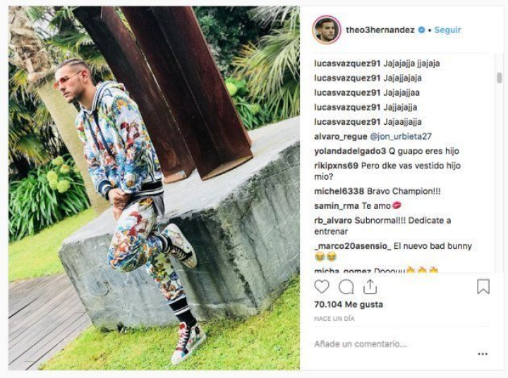 Theo Hernández, jugador de la Real Sociedad, cedido por el Real Madrid este verano, ha publicado una imagen en su cuenta de Instagram en la que aparece vestido con un llamativo conjunto y con un curioso peinado.