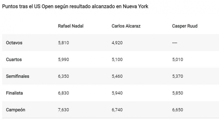 El ránking de la ATP va a tener nuevo líder. Tras la derrota en los octavos de final del Abierto de EEUU del ruso Daniil Medvedev, hay una vacante para rellenar con uno de estos tres nombres: Rafael Nadal, Carlos Alcaraz y Casper Ruud. La probabilidad es mayor para que el ránking quede liderado por un español pero todo depende de lo que ocurra durante lo que queda en el torneo.