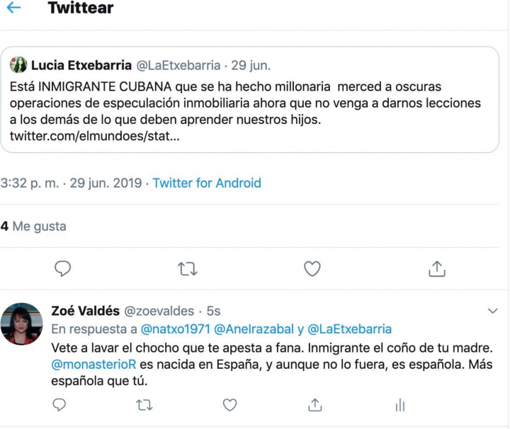 Poco después, llegó el contraataque de Valdés: “Vete a lavar el chocho que te apesta a fana. Rocío Monasterio es nacida en España, y aunque no lo fuera, es española. Más española que tú”.