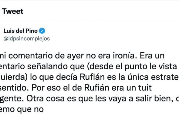 A este tuit, el periodista ha replicado diciendo que no era ironía y que lo decía en serio: “No, mi comentario de ayer no era ironía. Era un comentario señalando que (desde el punto le vista de la izquierda) lo que decía Rufián es la única estrategia con sentido. Por eso el de Rufián era un tuit inteligente. Otra cosa es que les vaya a salir bien, que me temo que no”.