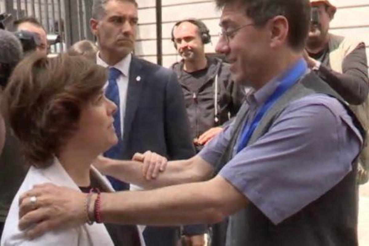 En el patio de la Cámara Baja, la ya exvicepresidenta se dirigía hacia su coche cuando el cofundador de Podemos, Juan Carlos Monedero la cogió de los hombros y, con una sonrisa, le dijo que se alegraba de la salida de la Moncloa de Mariano Rajoy.
