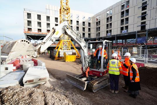 Manejando una grúa durante una visita a las obras de un puerto en Blackpool