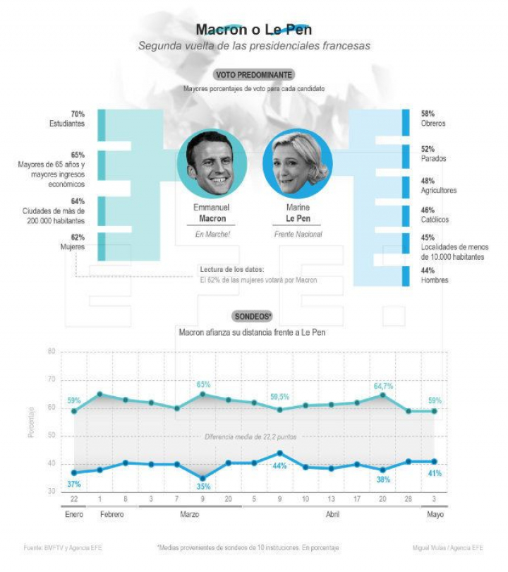 A ella la recibieron entre aplausos y fotos, a él con abucheos. Y ahí está el gran riesgo de Macron: muchos sólo ven en él al candidato que posa para portadas, al exbanquero y exministro que carga con la imagen de hombre de la élite, más cómodo en los pasillos del poder que en el barro de los suburbios industriales. Ella, sin embargo, se presenta como la protectora de la gente de la calle ante las fuerzas ciegas de la globalización. A Macron le sigue costando conectar con ese sector de la población. Fue justo el que le dio el voto en EEUU a Donald Trump.