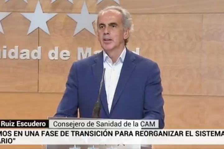 La presidenta de la Comunidad de Madrid, Isabel Díaz Ayuso, y el consejero de Sanidad de la región, Enrique Ruiz Escudero, han comparecido este sábado en rueda de prensa después de que el Gobierno dejara en fase cero a esta comunidad.