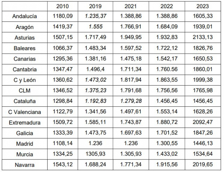 En la tabla siguiente se recoge el presupuesto por habitante y año previsto para 2023 en cada una de las comunidades; en el caso de Cataluña se recoge el mismo del año anterior: