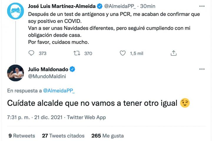 Después le ha tocado el turno al alcalde de Madrid, que también en Twitter ha afirmado: “Después de un test de antígenos y una PCR, me acaban de confirmar que soy positivo en COVID. Van a ser unas Navidades diferentes, pero seguiré cumpliendo con mi obligación desde casa. Por favor, cuidaos mucho”.