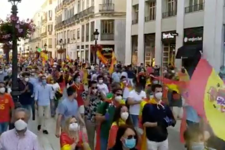 Fue una de las imágenes de este jueves: la calle Larios de Málaga repleta de manifestantes con banderas de España protestando contra el Gobierno sin respetar la distancia de seguridad en plena pandemia de coronavirus.