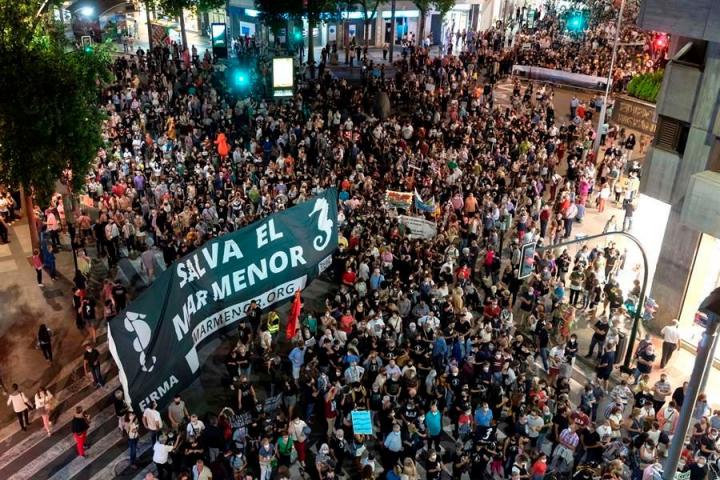 Un mes y medio después del último episodio de mortandad de fauna marina a causa de la anoxia provocada por el proceso de eutrofización extremo de la laguna, los manifestantes han recorrido las principales vías hasta confluir las dos cabeceras en la Gran Vía, desde donde han marchado hasta la consejería de Agua, Agricultura, Ganadería, Pesca y Medio Ambiente.
