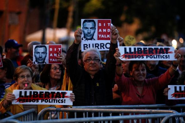 Bajo un llamamiento de ‘Picnic por la República’, los ciudadanos han acudido con silbatos, junto a letreros con la leyenda, sit and talk (siéntate y habla), una proclama defendida por los independentistas. Desde antes del comienzo del evento se han escuchando gritos de “Sánchez, no eres bienvenidos” y a favor de la independencia.