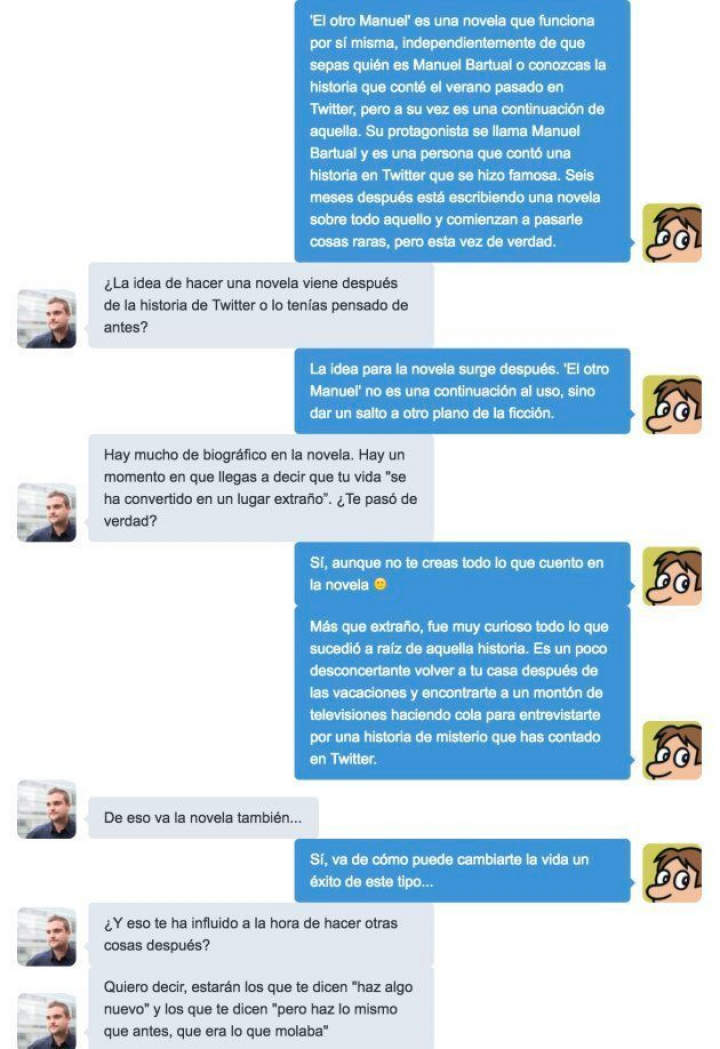 Ahora, Bartual publica su primera novela, El otro Manuel (ed. Planeta) y sitúa la acción seis meses después del relato que le cambió la vida. El texto tiene algo de autobiográfico y cuenta lo que supuso para él convertirse en una cara conocida de la noche a la mañana.