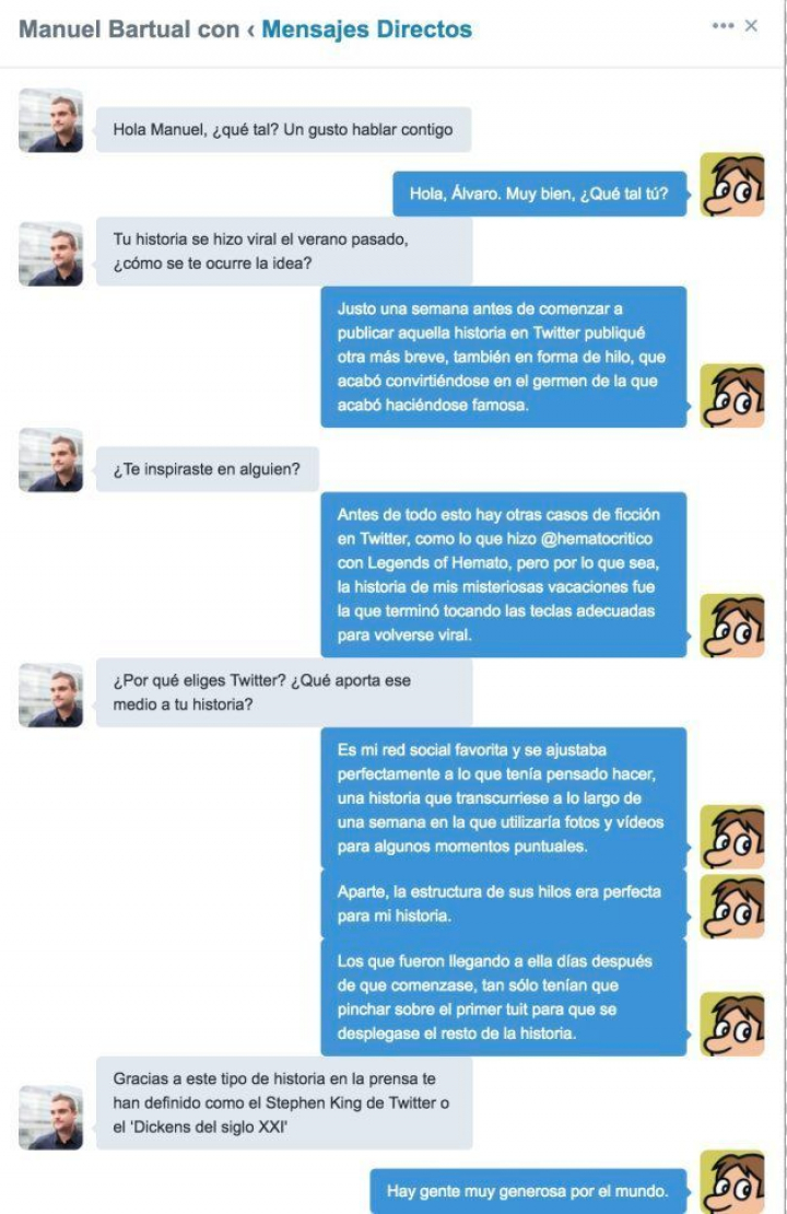 Como la historia se hizo viral por Twitter, hemos entrevistado a Bartual a través de la red social que lo lanzó a la fama.