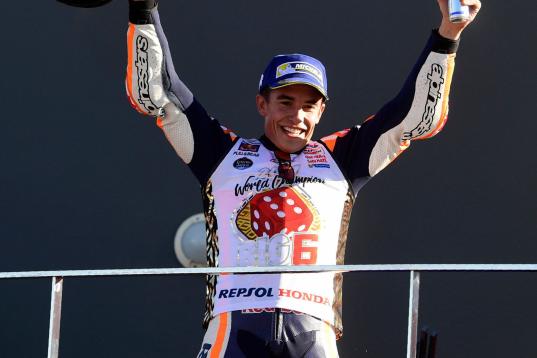 En medio del delirio del público asistente en el trazado de Cheste, Márquez tomó su bandera del '93', tras encender la tradicional traca, y dio la vuelta de honor antes de celebrar con sus aficionados su nuevo título, el sexto. Y se presumen más.