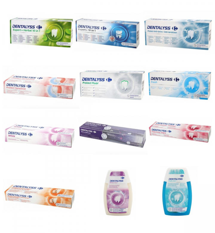 Carrefour dispone de 14 tipos de pasta de dientes, entre ellas anticaries, extra fresh, herbal, para encías, para sensibilidad dental o extra flúor. Para todos ellos, la compañía francesa tiene como proveedor a laboratorios Boniquet con sede en Santa Perpetua de Mogoda (Barcelona). Además, tiene plantas en México D.F, en Madrid (orientada a productos de cuidado personal como toallitas) y otra en Alicante.