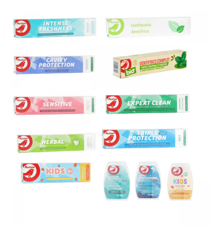 En el caso de Alcampo dispone de nueve pastas dentífricas bajo su marca, cinco bajo la indicación infantil y una en la bio. En todas ellas aparece Auchan como fabricante, es decir, que tienen un laboratorio propio para sus dentífricos.