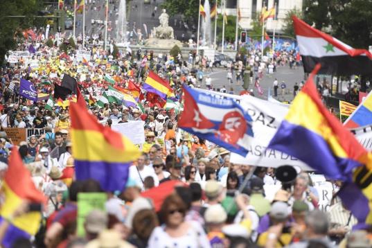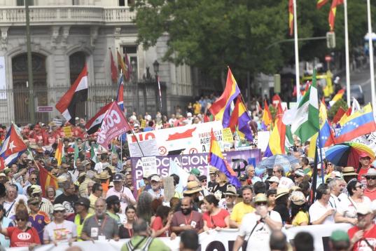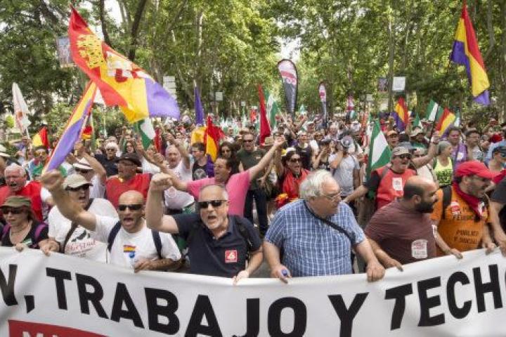 Bajo el lema "Pan, trabajo, techo e igualdad", las cuatro columnas que integran la marcha han confluido en la fuente de Neptuno, desde donde se han dirigido en un ambiente festivo a la Plaza de España coreando lemas como "De norte a sur, de este a oeste, la lucha sigue, cueste lo que cueste".