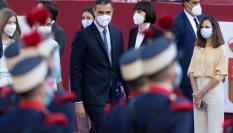 El clásico recuperado de marcialidad, uniformes coloridos, acrobacias, cabras y banderas que llegan del cielo ha centrado también su atención en el presidente del Gobierno, Pedro Sánchez, abucheado a su llegada como siempre desde que está en La Moncloa, pero algo menos que otros años. Seguramente porque, en contra de lo que marca el protocolo, el socialista ha llegado un minuto más tarde que los reyes Felipe y Letizia, los ha hecho esperar y los críticos se han visto forzados, por la coincidencia, ser más prudentes. Ha sido la imagen de la mañana, los reyes en su coche esperando al mandatario. Las peticiones de dimisión se han vuelto a escuchar al final del acto, más nítidas. Sánchez las escuchaba con estoicismo, ante la mirada orgullosa de Margarita Robles, la ministra de Defensa.