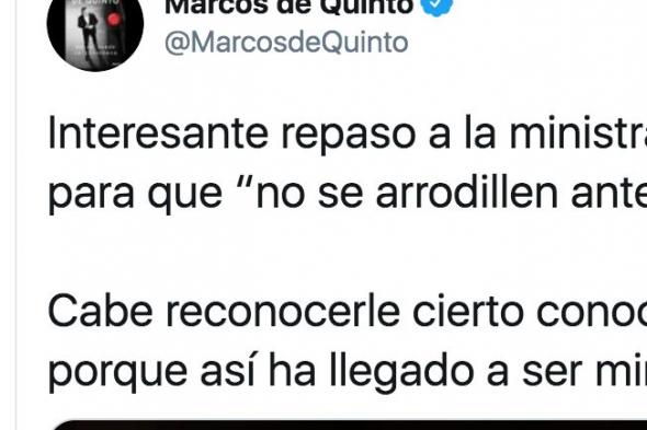 “Interesante repaso a la ministra que alerta a las mujeres para que “no se arrodillen ante los hombres”″, escribe De Quinto, que añade la siguiente frase: “Cabe reconocerle cierto conocimiento en este tema, porque así ha llegado a ser ministra”.