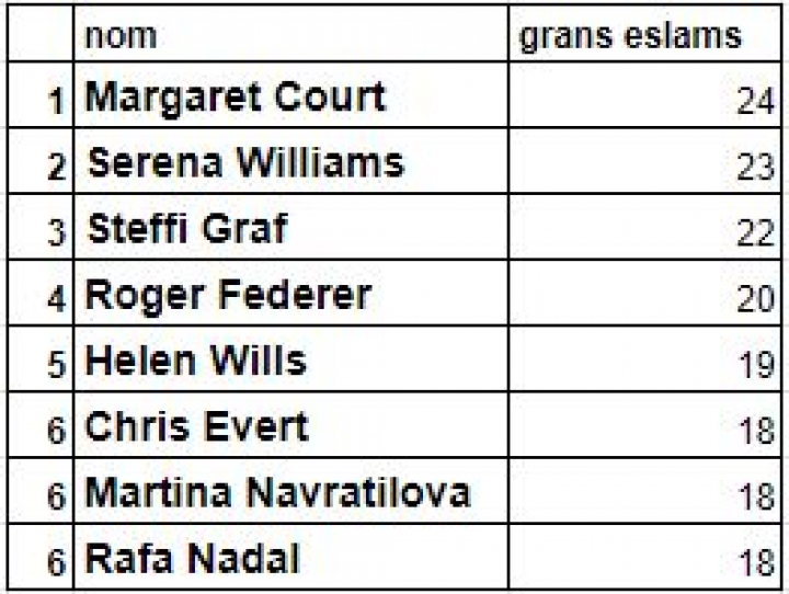 Ni Court, Williams, Graf, Roger, Wills, Evert, Navratilova i Rafa, que la llengua evidentment permet enunciar però que tampoc seria gens recomanable.