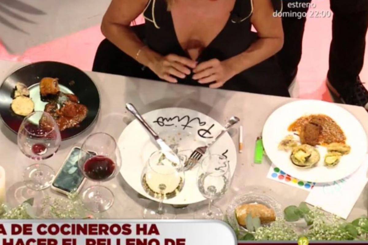 La colaboradora de Sálvame y presentadora de Socialité se convirtió en ‘trending topic’ durante buena parte de la noche, no sólo por su canción dedicada a Terelu o su peculiar forma de probar la comida, sino por lo que dejó ver encima de la mesa.