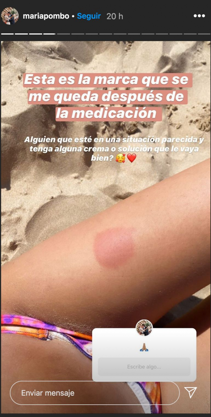 “Esta es la marca que se me queda después de la medicación”, ha escrito en una imagen publicada en stories donde se ve su muslo con la mancha roja a la que se refiere. Además, la influencer pide ayuda a su millón y medio de seguidores por si alguien ha sufrido un efecto similar. ”¿Alguien que esté en una situación parecida y tenga alguna crema o solución que le vaya bien?”, ha preguntado.