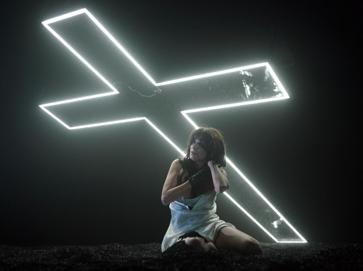 Bien, hasta aquí los objetivos. La pregunta crítica es ¿los consiguen? Belleza visual en el escenario de la Abadía, esa preciosa iglesia convertida en teatro, hay a puñados. Curiosamente conseguido gracias a una gran cruz de 300 kilos cubierta de espejo y a una tierra negra, que se ha vuelto recurrente en el teatro desde que Lluis Pasqual la usara, en color azul, en El Público. Espacio al que contribuye una iluminación eficaz e inteligentemente usada.