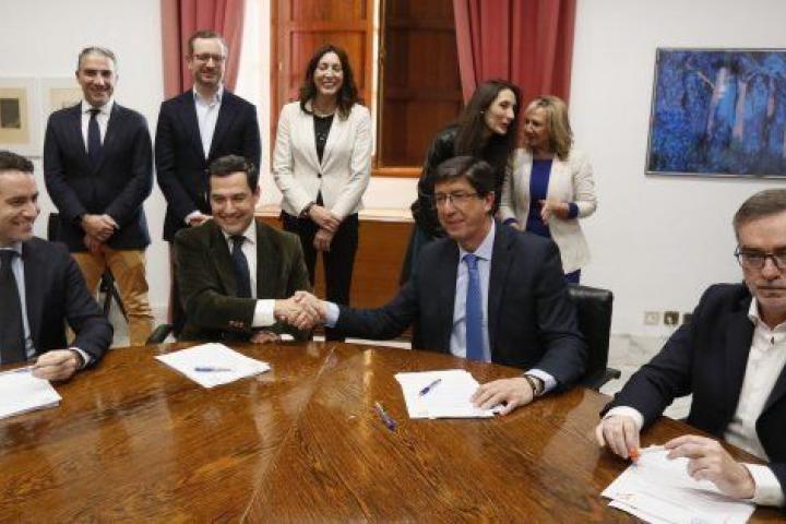 Ciudadanos pactó con el PP a primera hora de la tarde las condiciones para el futuro Ejecutivo andaluz, y posteriormente los populares sellaron un documento con 37 puntos con Vox. No hubo foto de los tres partidos, pero son necesarios los votos de estas tres formaciones para que Juanma Moreno (PP) sea presidente y Juan Marín (Cs), vicepresidente.